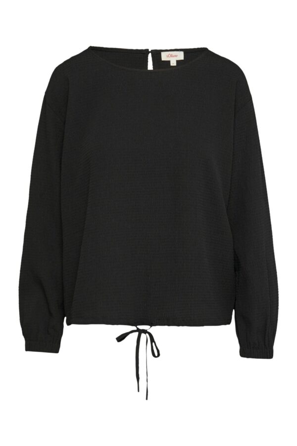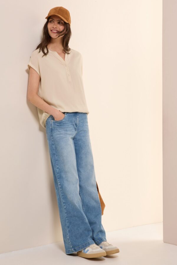 Der feminine Split Neck mit dekorativer Knopfleiste setzt elegante Akzente, während die kurzen Ärmel den lässigen Casual-Style unterstreichen. Der elastische Saum sorgt für einen lockeren Fall und einen besonders bequemen Sitz.