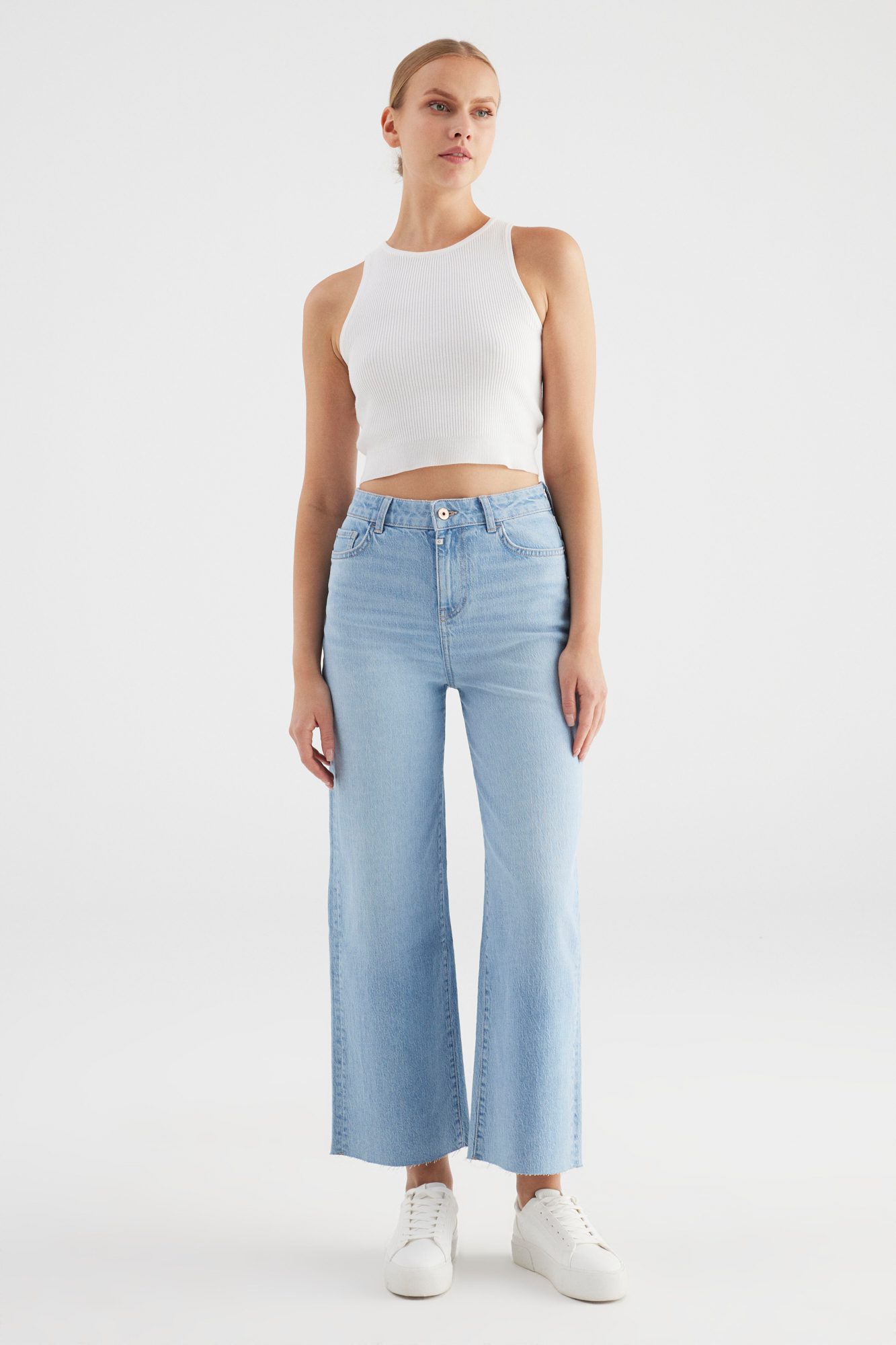 Die helle Light Blue Waschung verleiht der Jeans einen frischen, unkomplizierten Charakter – ideal für Frühling, Sommer und cleane Alltagslooks. Der Raw Edge Saum auf Knöchellänge setzt ein modisches Detail und macht die Jeans zum echten Hingucker.