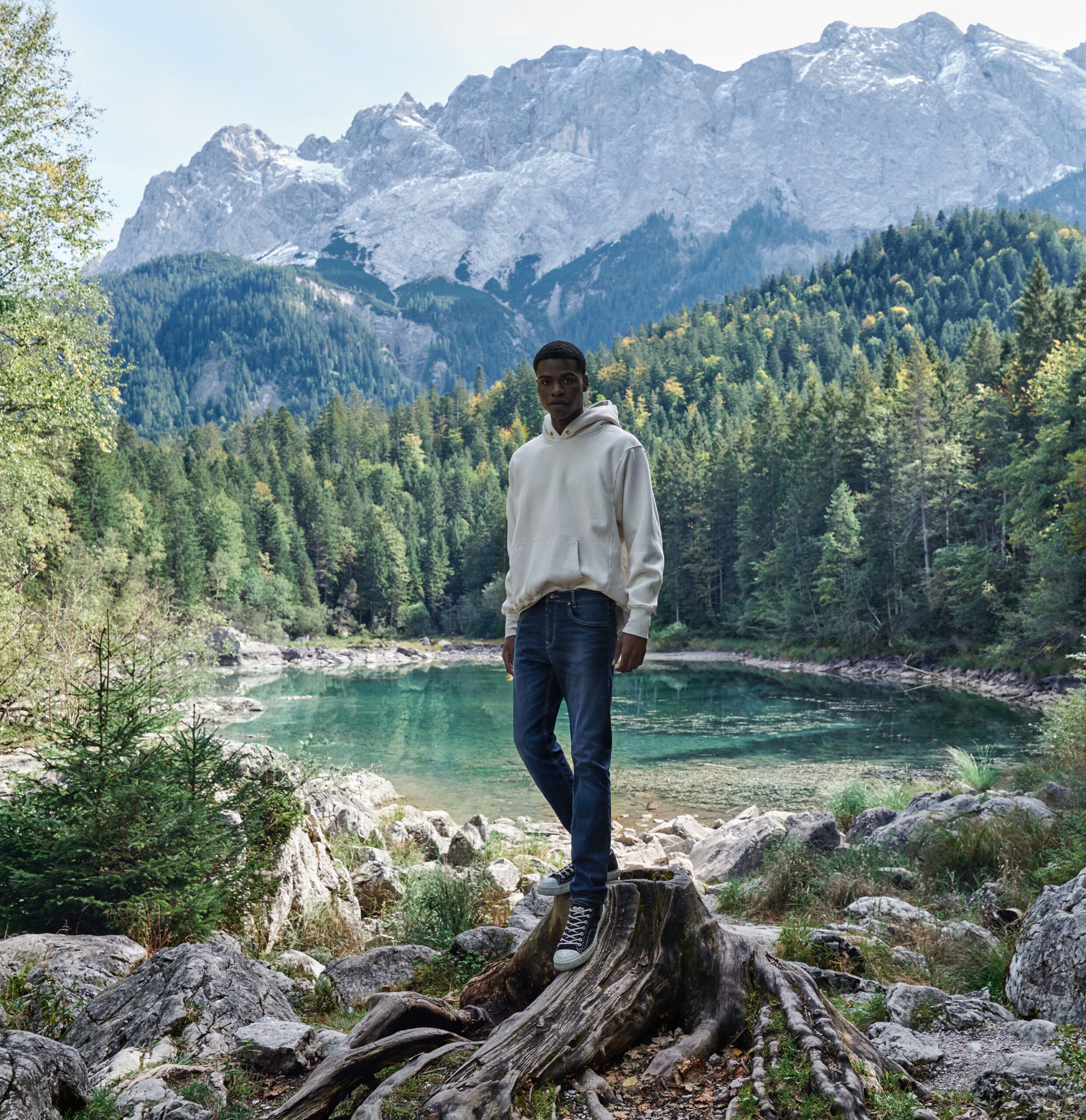 Das Model ist 1,85 m groß und trägt Bundweite 33 / Länge 32.
