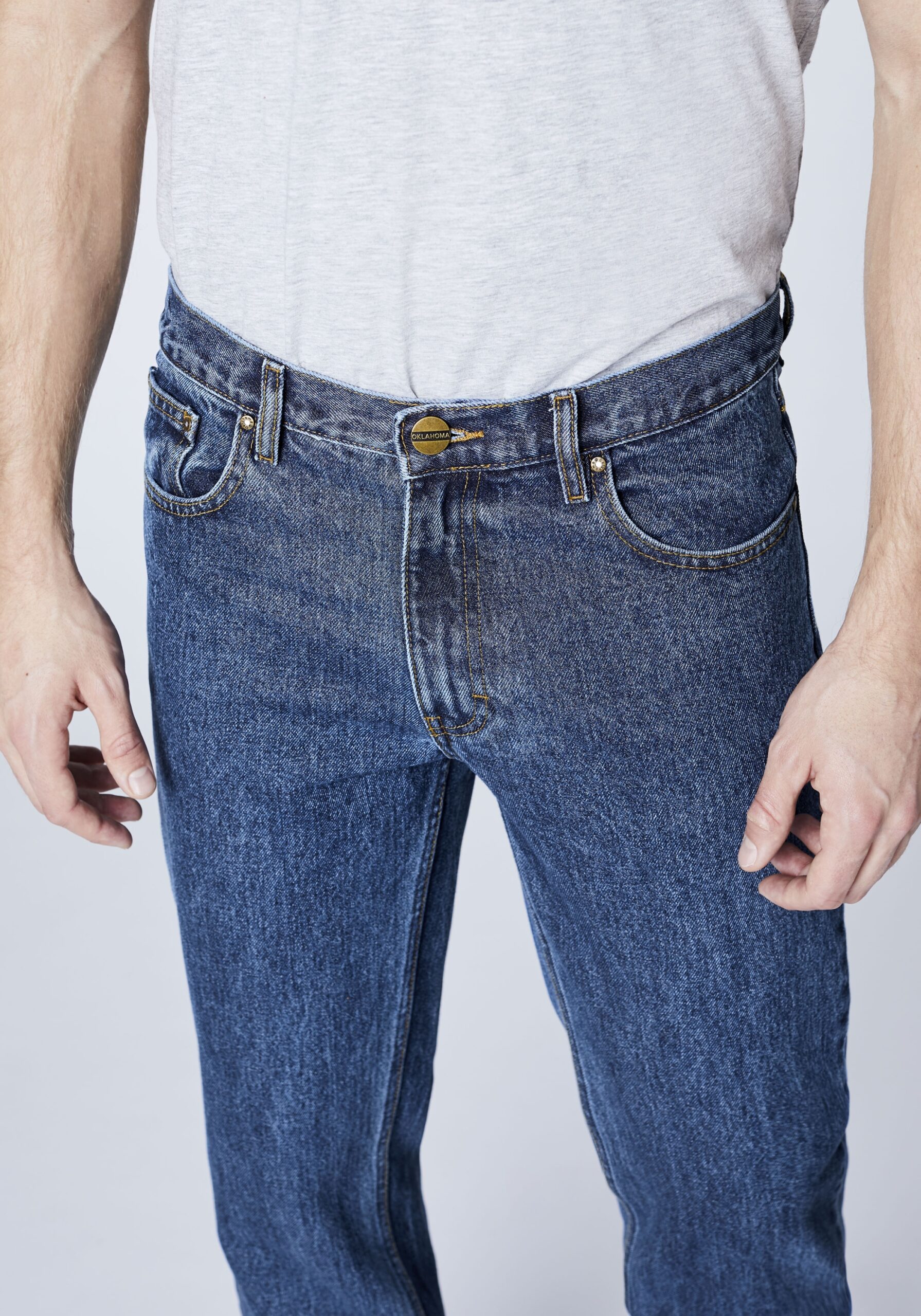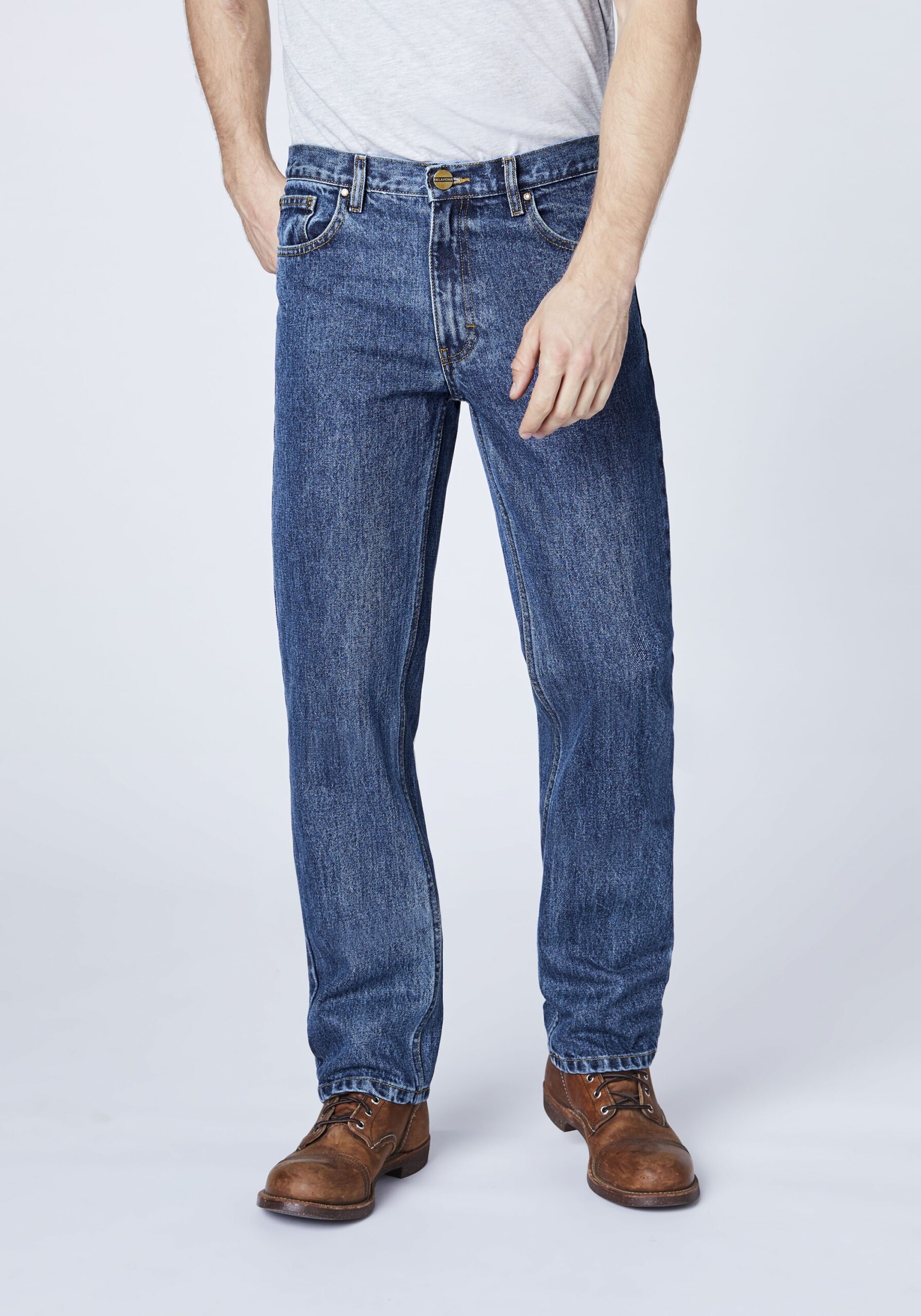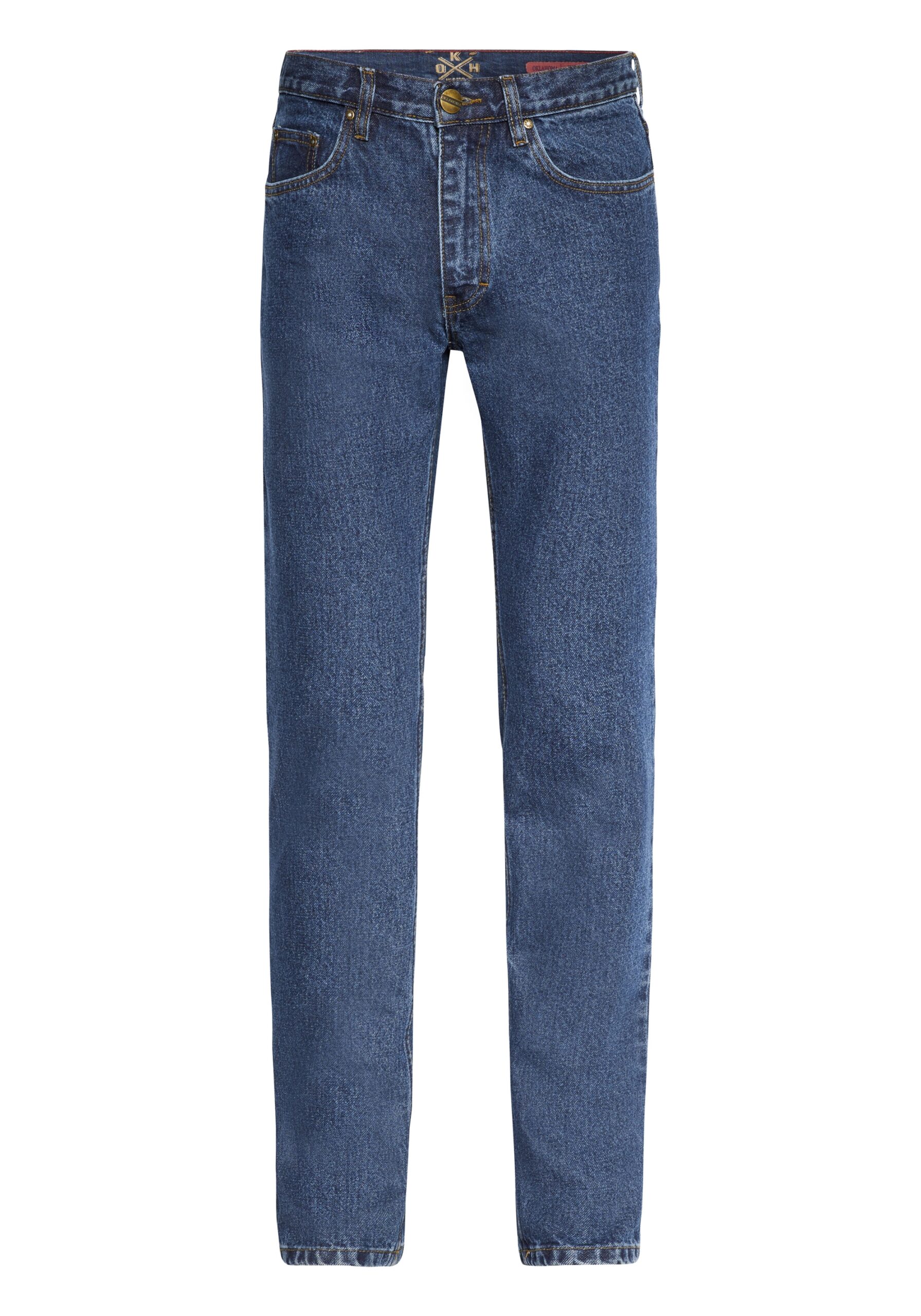 Coole Basic-Jeans von OKLAHOMA für alle Tage! Die lässig geschnittene Herren-Denim im Five-Pocket-Stil zeigt sich mit einem geraden Beinverlauf und ergänzt maskuline Casual-Outfits perfekt. Sie ist aus Baumwolle mit Elasthan-Anteil gefertigt und garantiert ein angenehmes Tragegefühl.