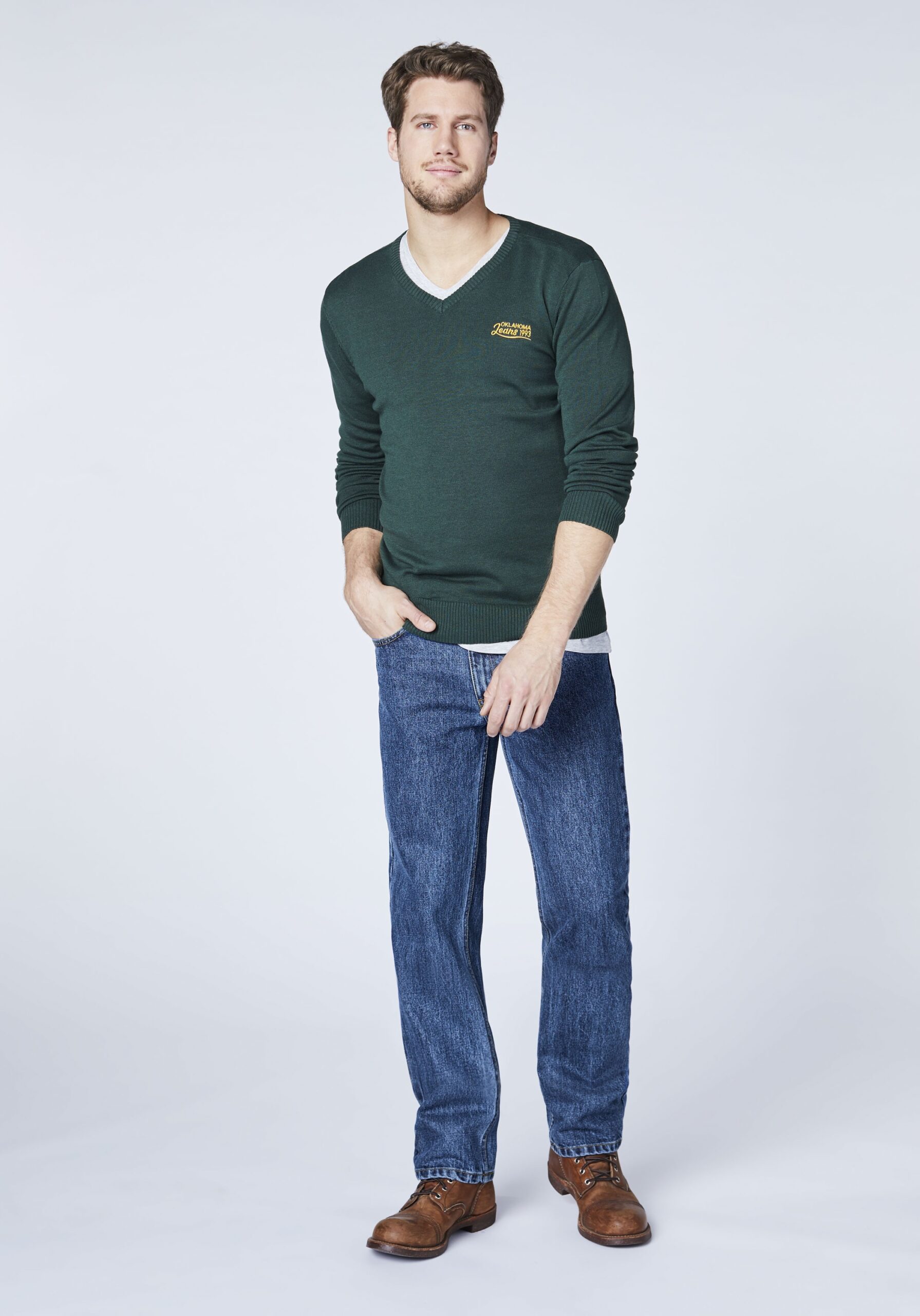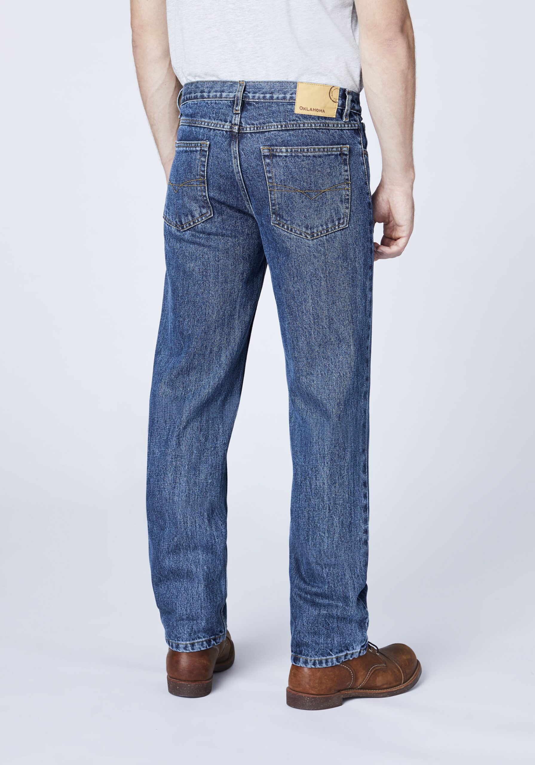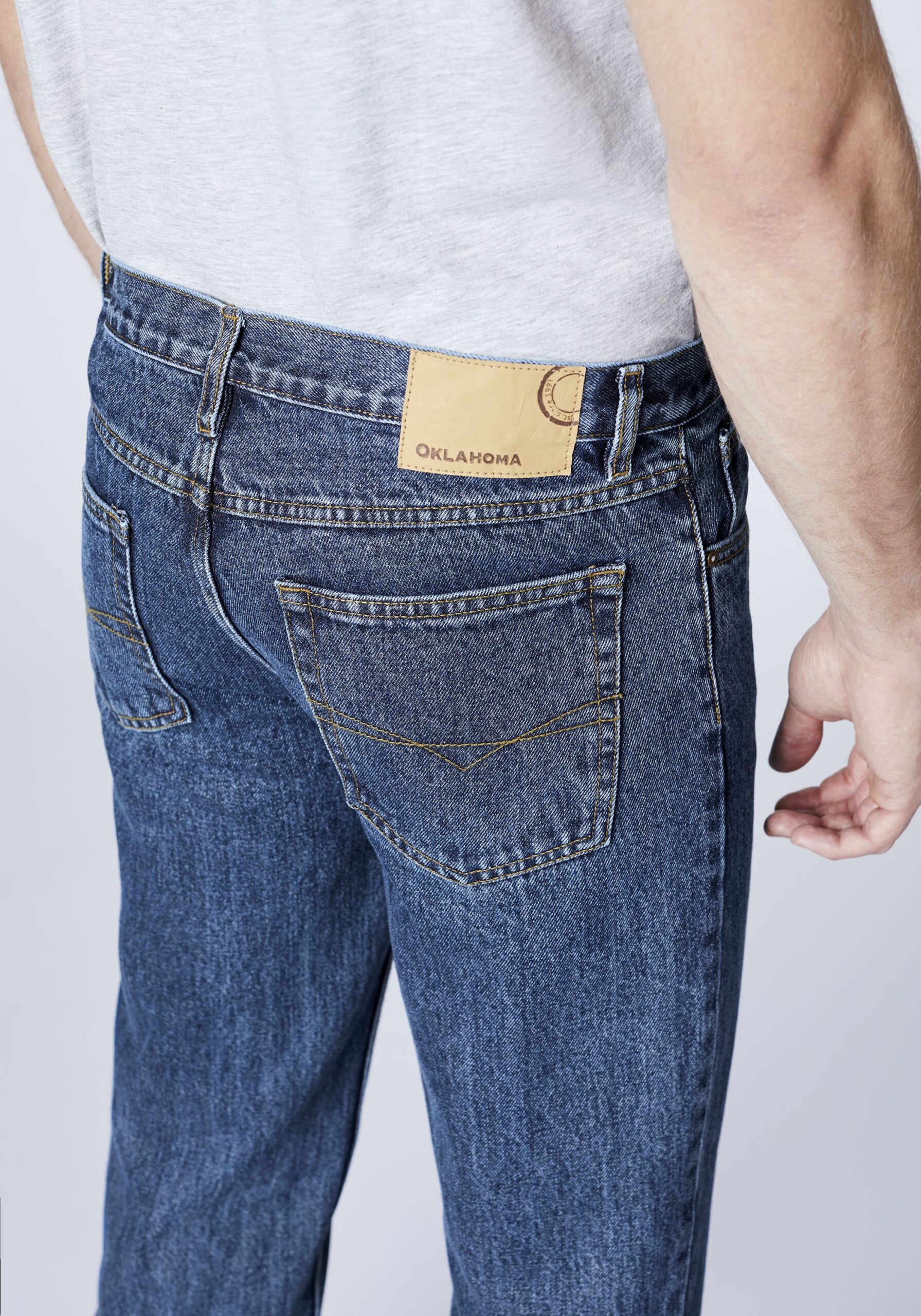 Coole Basic-Jeans von OKLAHOMA für alle Tage! Die lässig geschnittene Herren-Denim im Five-Pocket-Stil zeigt sich mit einem geraden Beinverlauf und ergänzt maskuline Casual-Outfits perfekt. Sie ist aus Baumwolle mit Elasthan-Anteil gefertigt und garantiert ein angenehmes Tragegefühl.