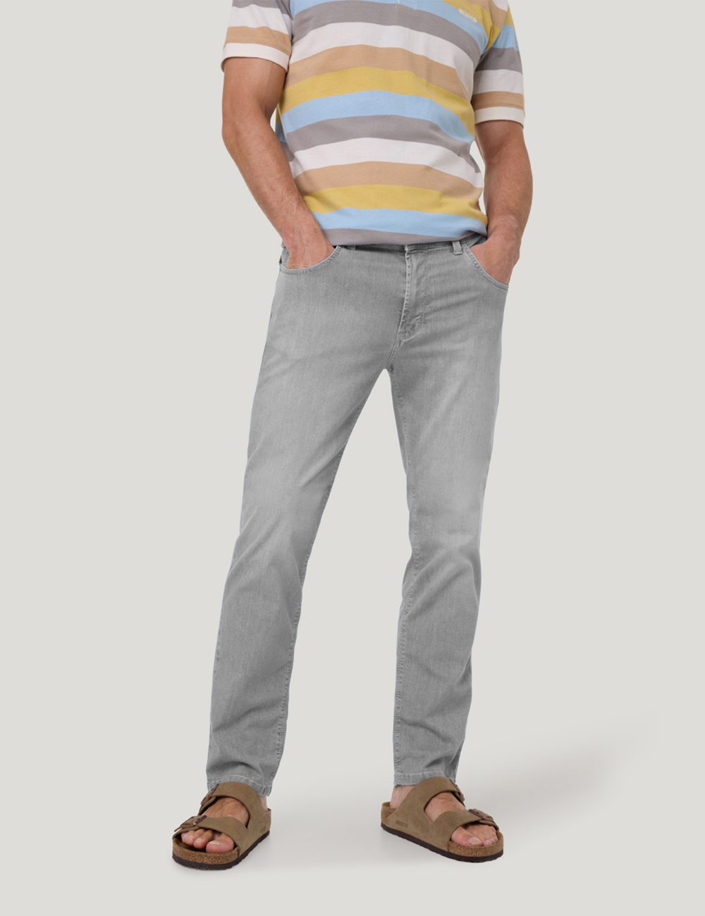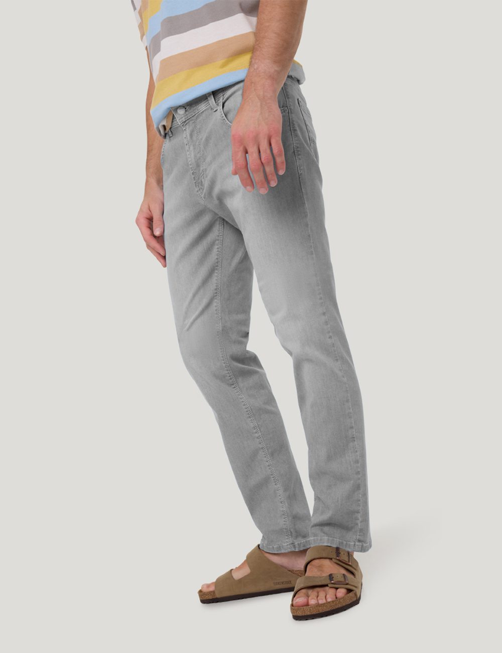 Das klassische 5-Pocket-Design wird durch markante Steppungen mit kräftigem Garn akzentuiert. Der hochwertige Stretch Denim mit MEGAFLEX-Technologie sorgt für maximale Bewegungsfreiheit, Formstabilität und angenehmen Sitz den ganzen Tag über. In der trendigen Farbe Light Grey wird die Rando zum idealen Kombipartner – ob sportlich mit Sneakern oder smart-casual mit Hemd und Sakko.