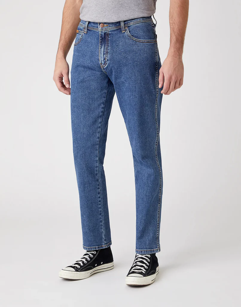 Die Regular/Slim Fit Passform sitzt bequem an Hüfte und Oberschenkel und läuft zum Beinende leicht schmal aus. Der Stretchanteil im Denim sorgt für optimale Bewegungsfreiheit und ganztägigen Tragekomfort, ohne die klassische Wrangler-Optik zu verlieren. Typische Details wie das 5-Pocket-Design, markante Nähte und das Lederpatch auf der Rückseite runden den authentischen Look ab.
